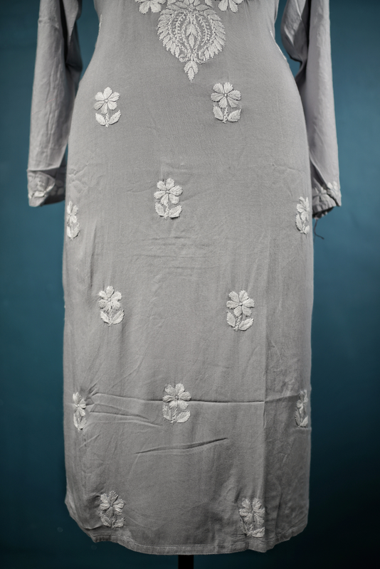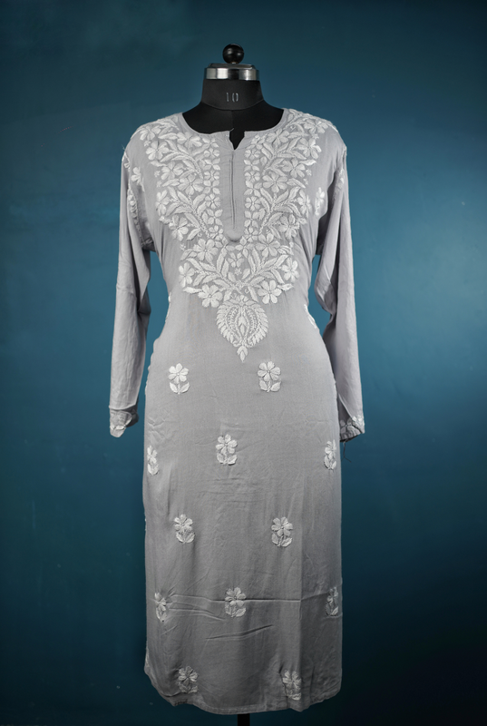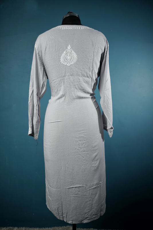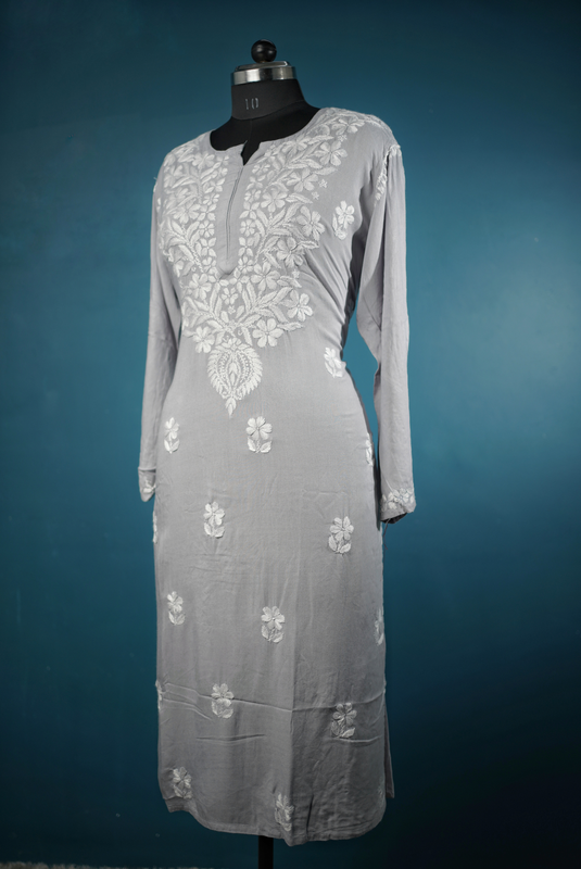 chikankari hand embroidery Lucknowi riyon kurti for women embroidery Hand work (Beautifull fine And Fancy)kurti Fabric -RiyonLength of kurti- Approx 46sizes Available 38-46color Of kurti – Grey